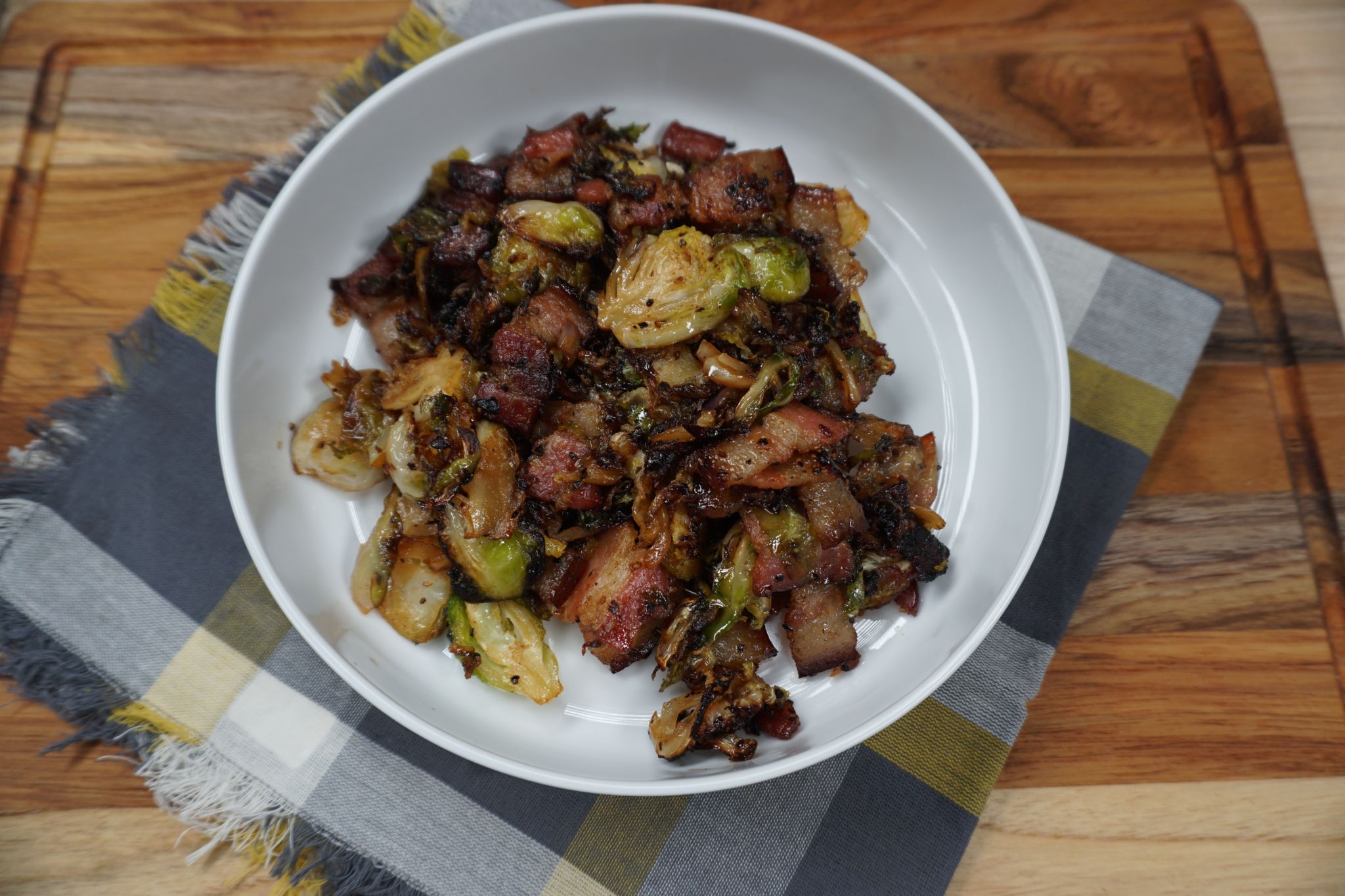 Thinly sliced Brussels sprouts lovingly sau- téed with butter and bacon and topped with a sweet maple and balsamic glaze